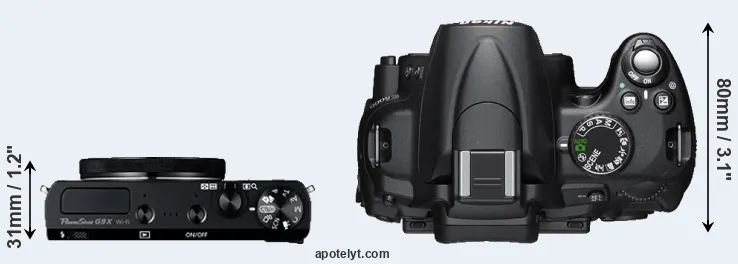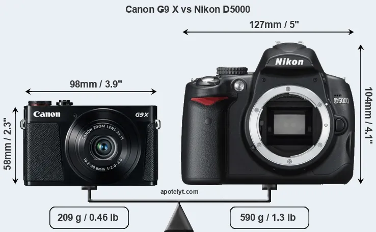The physical size and weight of the Canon G9 X and the Nikon D5000 are illustrated in the side-by-side display below. The two cameras are presented according to their relative size. Three consecutive perspectives from the front, the top, and the back are available. All width, height and depth dimensions are rounded to the nearest millimeter.