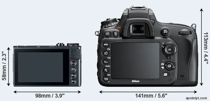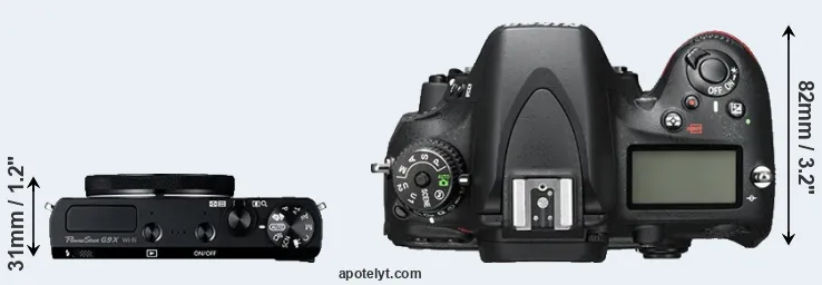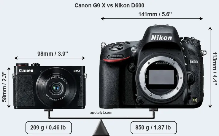 The physical size and weight of the Canon G9 X and the Nikon D600 are illustrated in the side-by-side display below. The two cameras are presented according to their relative size. Three consecutive perspectives from the front, the top, and the back are available. All width, height and depth measures are rounded to the nearest millimeter.