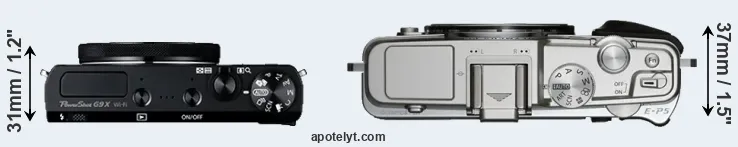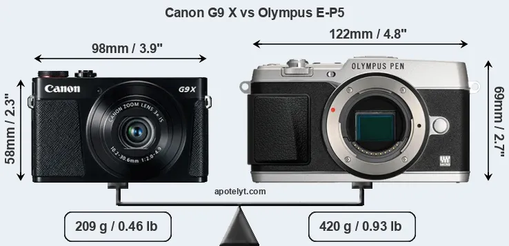 The side-by-side display below illustrates the physical size and weight of the Canon G9 X and the Olympus E-P5. The two cameras are presented according to their relative size. Three consecutive views from the front, the top, and the rear side are shown. All width, height and depth dimensions are rounded to the nearest millimeter.