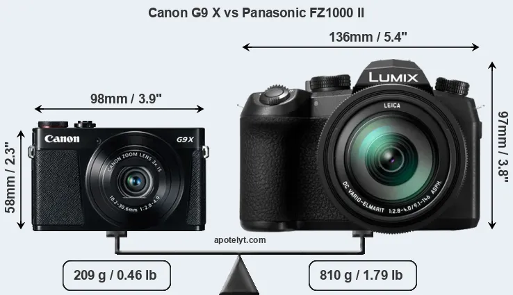 The side-by-side display below illustrates the physical size and weight of the Canon G9 X and the Panasonic FZ1000 II. The two cameras are presented according to their relative size. Three consecutive perspectives from the front, the top, and the back are available. All size dimensions are rounded to the nearest millimeter.