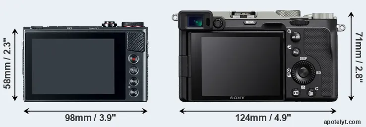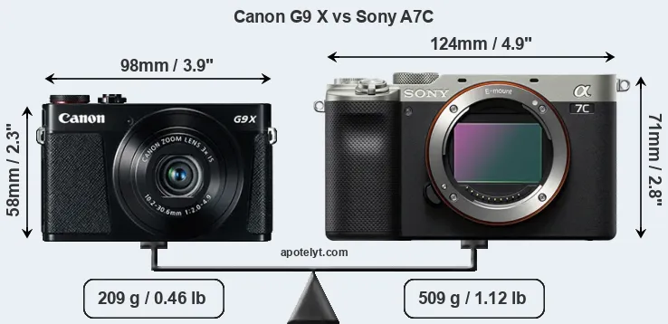 An illustration of the physical size and weight of the Canon G9 X and the Sony A7C is provided in the side-by-side display below. The two cameras are presented according to their relative size. Three consecutive perspectives from the front, the top, and the back are available. All width, height and depth dimensions are rounded to the nearest millimeter.