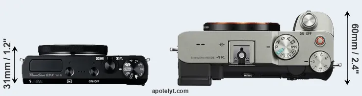 If the front view area (width x height) of the cameras is taken as an aggregate measure of their size, the Sony A7C is considerably larger (55 percent) than the Canon G9 X. It is noteworthy in this context that the A7C is splash and dust-proof, while the G9X does not feature any corresponding weather-sealing.