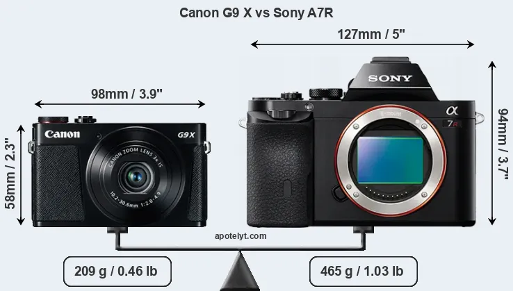 The side-by-side display below illustrates the physical size and weight of the Canon G9 X and the Sony A7R. The two cameras are presented according to their relative size. Three consecutive views from the front, the top, and the rear side are shown. All width, height and depth dimensions are rounded to the nearest millimeter.
