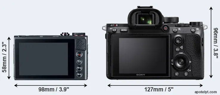 If the front view area (width x height) of the cameras is taken as an aggregate measure of their size, the Sony A7R III is considerably larger (114 percent) than the Canon G9 X. It is noteworthy in this context that the A7R III is splash and dust-proof, while the G9X does not feature any corresponding weather-sealing.