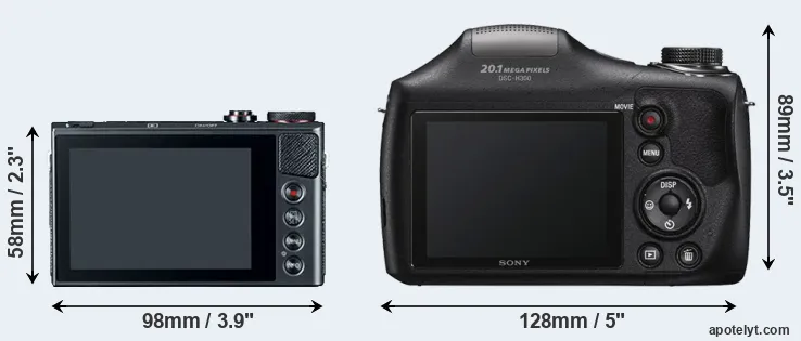 If the front view area (width x height) of the cameras is taken as an aggregate measure of their size, the Sony H300 is considerably larger (100 percent) than the Canon G9 X. Moreover, the H300 is substantially heavier (182 percent) than the G9X. In this context, it is worth noting that neither the G9X nor the H300 are weather-sealed.