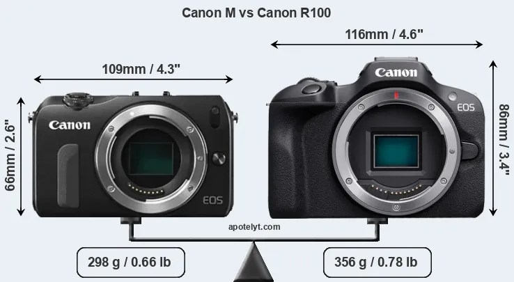 The physical size and weight of the Canon M and the Canon R100 are illustrated in the side-by-side display below. The two cameras are presented according to their relative size. Three successive views from the front, the top, and the rear are shown. All width, height and depth measures are rounded to the nearest millimeter.
