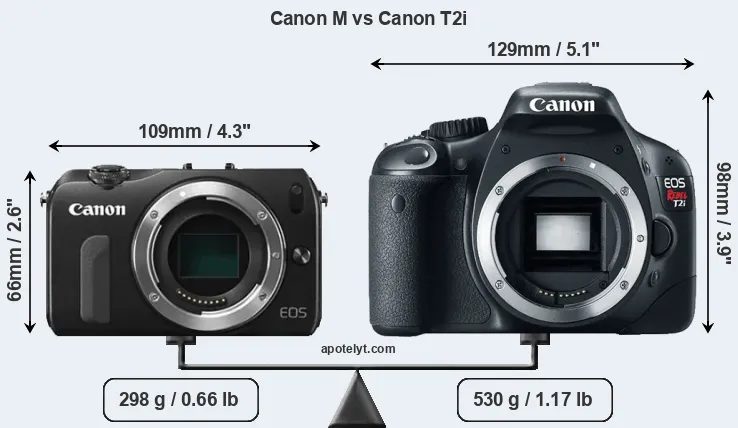 If the front view area (width x height) of the cameras is taken as an aggregate measure of their size, the Canon T2i is considerably larger (76 percent) than the Canon M. Moreover, the T2i is substantially heavier (78 percent) than the Canon M. In this context, it is worth noting that neither the Canon M nor the T2i are weather-sealed.