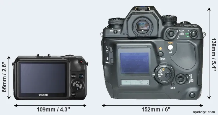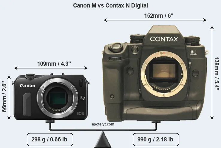 If the front view area (width x height) of the cameras is taken as an aggregate measure of their size, the Contax N Digital is considerably larger (192 percent) than the Canon M. Moreover, the N Digital is substantially heavier (232 percent) than the Canon M. In this context, it is worth noting that neither the Canon M nor the N Digital are weather-sealed.