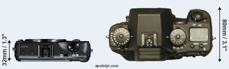 An illustration of the physical size and weight of the Canon M and the Contax N Digital is provided in the side-by-side display below. The two cameras are presented according to their relative size. Three consecutive perspectives from the front, the top, and the back are available. All width, height and depth dimensions are rounded to the nearest millimeter.