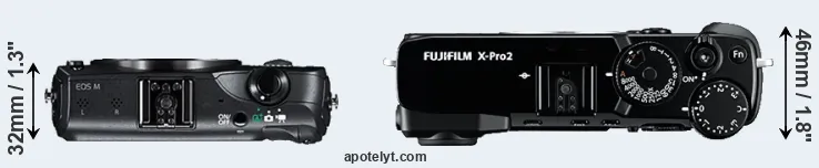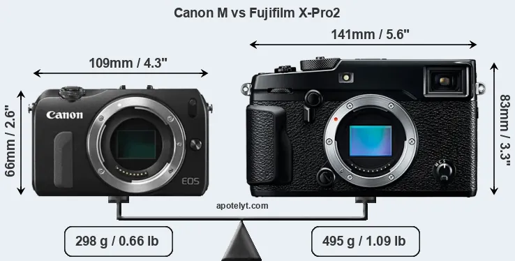 The side-by-side display below illustrates the physical size and weight of the Canon M and the Fujifilm X-Pro2. The two cameras are presented according to their relative size. Three consecutive perspectives from the front, the top, and the back are available. All width, height and depth measures are rounded to the nearest millimeter.