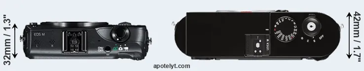 The Canon EOS M and the Leica M (Typ 262) are two digital cameras that were announced, respectively, in July 2012 and November 2015. The Canon M is a mirrorless interchangeable lens camera, while the M Typ 262 is a rangefinder-focusing mirrorless. The cameras are based on an APS-C (Canon M) and a full frame (M Typ 262) sensor. The Canon has a resolution of 17.9 megapixels, whereas the Leica provides 23.7 MP.