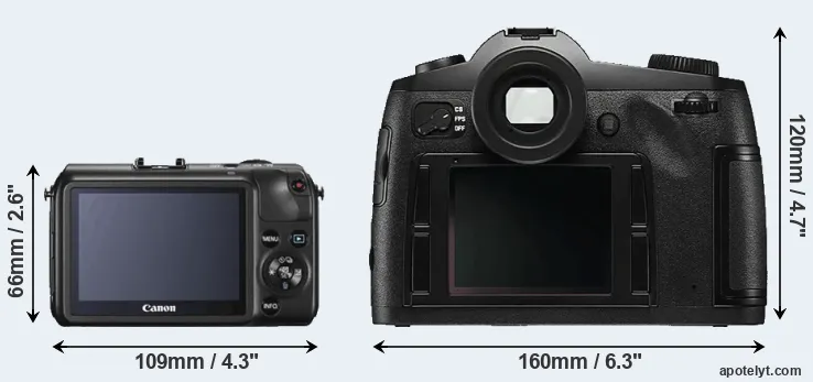 If the front view area (width x height) of the cameras is taken as an aggregate measure of their size, the Leica S Typ 006 is considerably larger (167 percent) than the Canon M. Moreover, the S Typ 006 is substantially heavier (323 percent) than the Canon M. It is noteworthy in this context that the S Typ 006 is splash and dust-proof, while the Canon M does not feature any corresponding weather-sealing.