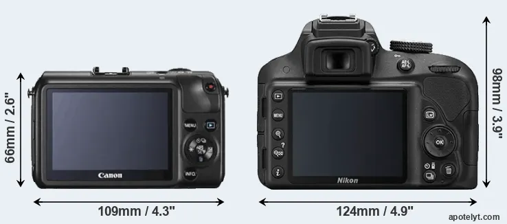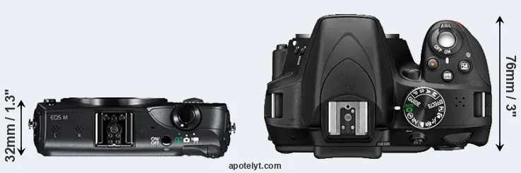 The physical size and weight of the Canon M and the Nikon D3300 are illustrated in the side-by-side display below. The two cameras are presented according to their relative size. Three consecutive views from the front, the top, and the rear side are shown. All size dimensions are rounded to the nearest millimeter.