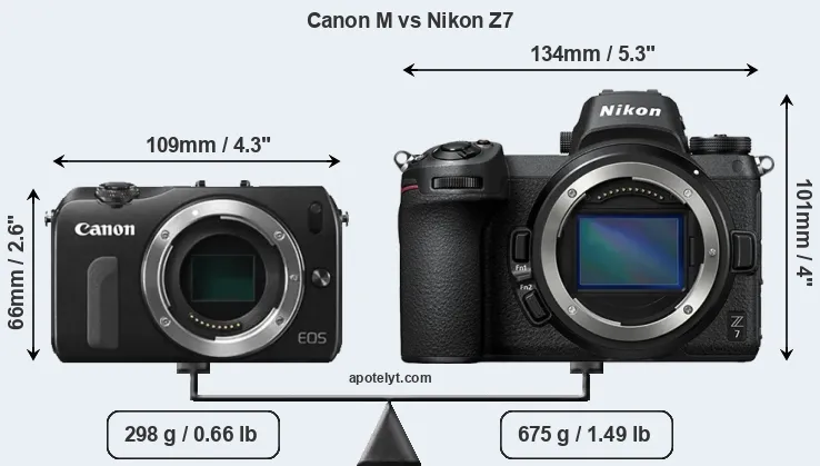 If the front view area (width x height) of the cameras is taken as an aggregate measure of their size, the Nikon Z7 is considerably larger (88 percent) than the Canon M. Moreover, the Z7 is substantially heavier (127 percent) than the Canon M. It is noteworthy in this context that the Z7 is splash and dust-proof, while the Canon M does not feature any corresponding weather-sealing.