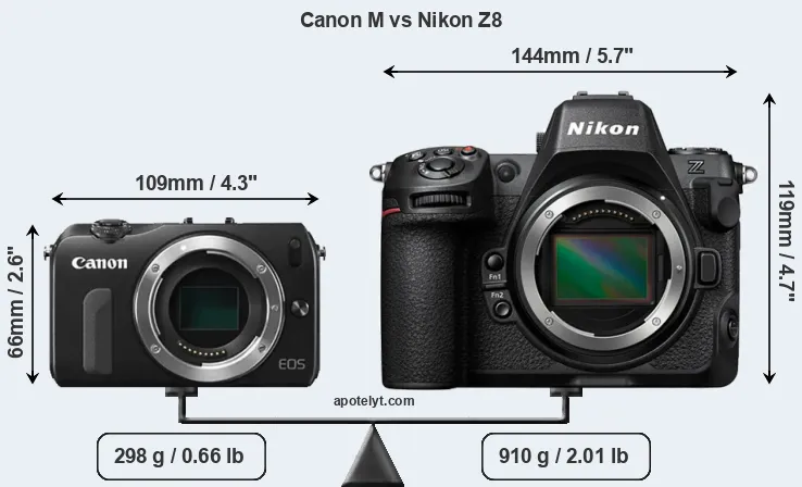If the front view area (width x height) of the cameras is taken as an aggregate measure of their size, the Nikon Z8 is considerably larger (138 percent) than the Canon M. Moreover, the Z8 is substantially heavier (205 percent) than the Canon M. It is noteworthy in this context that the Z8 is splash and dust-proof, while the Canon M does not feature any corresponding weather-sealing.