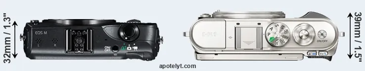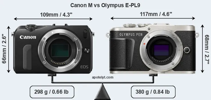 The side-by-side display below illustrates the physical size and weight of the Canon M and the Olympus E-PL9. The two cameras are presented according to their relative size. Three consecutive views from the front, the top, and the rear side are shown. All width, height and depth dimensions are rounded to the nearest millimeter.