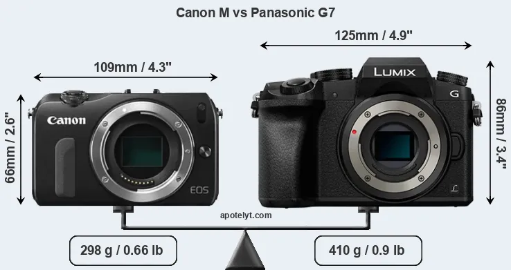 If the front view area (width x height) of the cameras is taken as an aggregate measure of their size, the Panasonic G7 is considerably larger (49 percent) than the Canon M. Moreover, the G7 is substantially heavier (38 percent) than the Canon M. In this context, it is worth noting that neither the Canon M nor the G7 are weather-sealed.