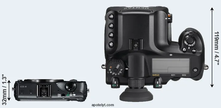 The side-by-side display below illustrates the physical size and weight of the Canon M and the Pentax 645D. The two cameras are presented according to their relative size. Three consecutive views from the front, the top, and the rear side are shown. All width, height and depth dimensions are rounded to the nearest millimeter.