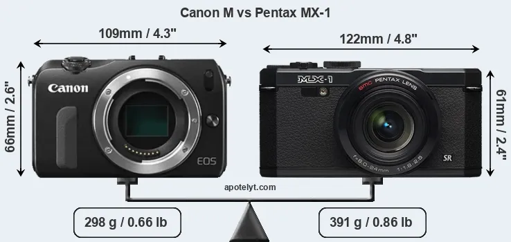 An illustration of the physical size and weight of the Canon M and the Pentax MX-1 is provided in the side-by-side display below. The two cameras are presented according to their relative size. Three consecutive views from the front, the top, and the rear side are shown. All width, height and depth measures are rounded to the nearest millimeter.
