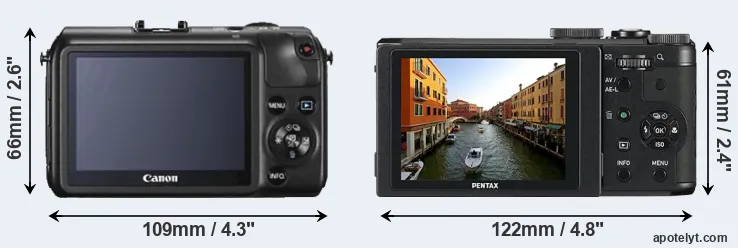 If the front view area (width x height) of the cameras is taken as an aggregate measure of their size, the Pentax MX-1 is somewhat larger (3 percent) than the Canon M. In this context, it is worth noting that neither the Canon M nor the MX-1 are weather-sealed.