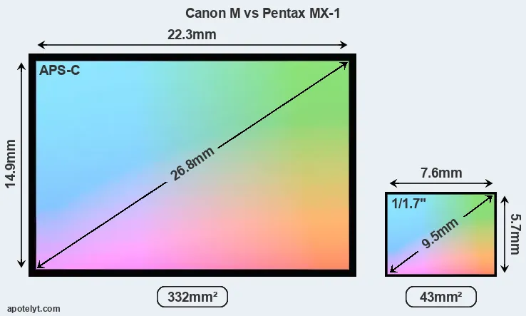 Of the two cameras under consideration, the Canon M features an APS-C sensor and the Pentax MX-1 a 1/1.7-inch sensor. The sensor area in the MX-1 is 87 percent smaller. As a result of these sensor size differences, the cameras have a format factor of, respectively, 1.6 and 4.5. The sensor in the Canon M has a native 3:2 aspect ratio, while the one in the MX-1 offers a 4:3 aspect.