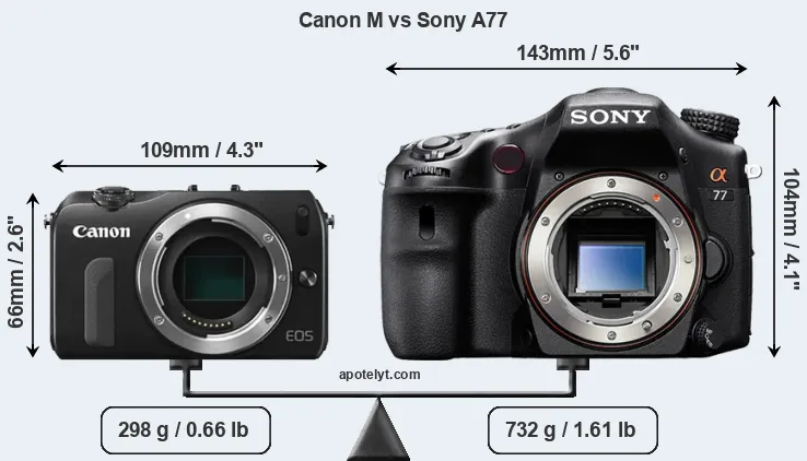 If the front view area (width x height) of the cameras is taken as an aggregate measure of their size, the Sony A77 is considerably larger (107 percent) than the Canon M. Moreover, the A77 is substantially heavier (146 percent) than the Canon M. It is noteworthy in this context that the A77 is splash and dust-proof, while the Canon M does not feature any corresponding weather-sealing.