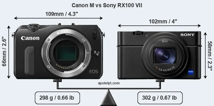 An illustration of the physical size and weight of the Canon M and the Sony RX100 VII is provided in the side-by-side display below. The two cameras are presented according to their relative size. Three successive views from the front, the top, and the rear are shown. All width, height and depth measures are rounded to the nearest millimeter.
