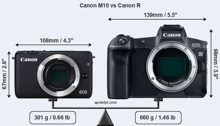 If the front view area (width x height) of the cameras is taken as an aggregate measure of their size, the Canon R is considerably larger (88 percent) than the Canon M10. Moreover, the Canon R is substantially heavier (119 percent) than the M10. It is noteworthy in this context that the Canon R is splash and dust-proof, while the M10 does not feature any corresponding weather-sealing.