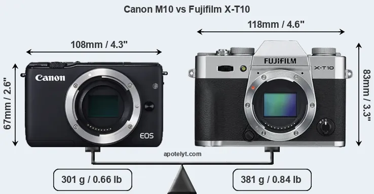 The physical size and weight of the Canon M10 and the Fujifilm X-T10 are illustrated in the side-by-side display below. The two cameras are presented according to their relative size. Three successive views from the front, the top, and the rear are shown. All width, height and depth measures are rounded to the nearest millimeter.