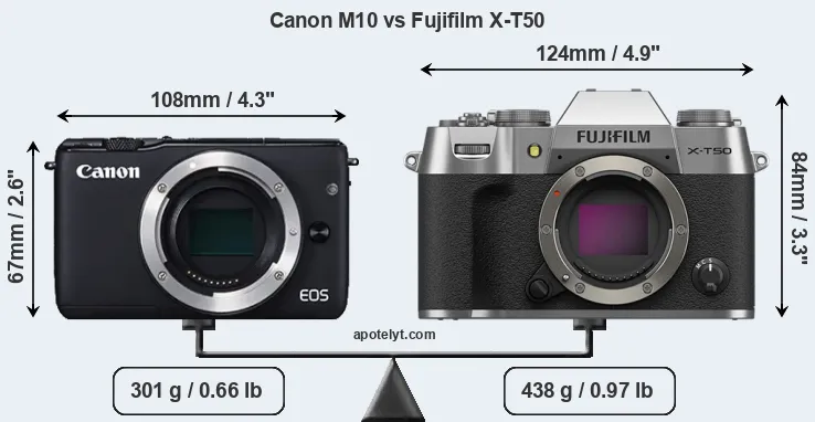 The physical size and weight of the Canon M10 and the Fujifilm X-T50 are illustrated in the side-by-side display below. The two cameras are presented according to their relative size. Three consecutive perspectives from the front, the top, and the back are available. All width, height and depth dimensions are rounded to the nearest millimeter.