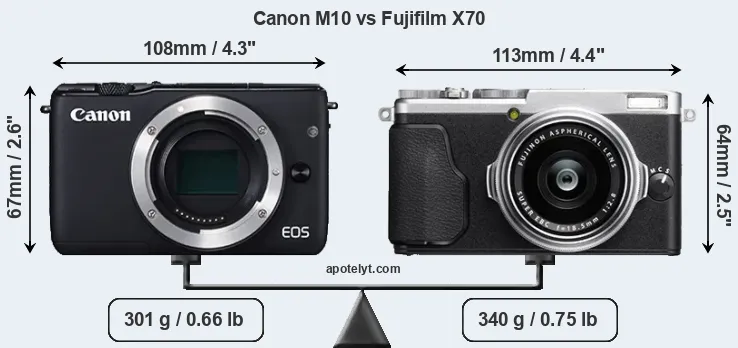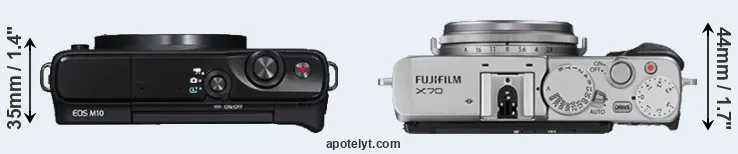 An illustration of the physical size and weight of the Canon M10 and the Fujifilm X70 is provided in the side-by-side display below. The two cameras are presented according to their relative size. Three consecutive views from the front, the top, and the rear side are shown. All width, height and depth measures are rounded to the nearest millimeter.