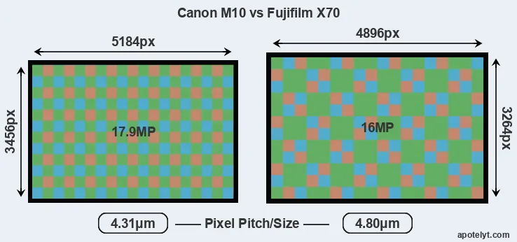 Despite having a smaller sensor, the Canon M10 offers a higher resolution of 17.9 megapixels, compared with 16 MP of the Fujifilm X70. This megapixels advantage comes at the cost of a higher pixel density and a smaller size of the individual pixel (with a pixel pitch of 4.31μm versus 4.80μm for the X70). Moreover, it should be noted that the X70 is a somewhat more recent model (by 3 months) than the M10, and its sensor might have benefitted from technological advances during this time that further enhance the light gathering capacity of its pixel-units. Coming back to sensor resolution, it should be mentioned that the X70 has no anti-alias filter installed, so that it can capture all the detail its sensor resolves.