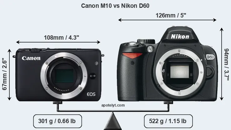 The side-by-side display below illustrates the physical size and weight of the Canon M10 and the Nikon D60. The two cameras are presented according to their relative size. Three consecutive views from the front, the top, and the rear side are shown. All width, height and depth dimensions are rounded to the nearest millimeter.
