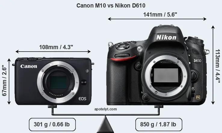 The side-by-side display below illustrates the physical size and weight of the Canon M10 and the Nikon D610. The two cameras are presented according to their relative size. Three consecutive views from the front, the top, and the rear side are shown. All width, height and depth measures are rounded to the nearest millimeter.