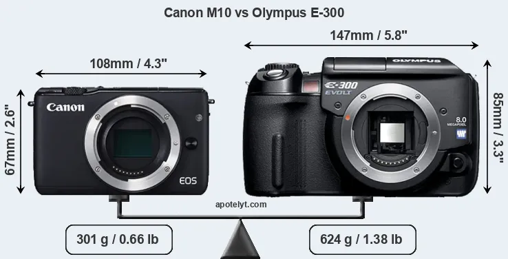 If the front view area (width x height) of the cameras is taken as an aggregate measure of their size, the Olympus E-300 is considerably larger (73 percent) than the Canon M10. Moreover, the E-300 is substantially heavier (107 percent) than the M10. In this context, it is worth noting that neither the M10 nor the E-300 are weather-sealed.