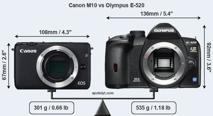 If the front view area (width x height) of the cameras is taken as an aggregate measure of their size, the Olympus E-520 is considerably larger (73 percent) than the Canon M10. Moreover, the E-520 is substantially heavier (78 percent) than the M10. In this context, it is worth noting that neither the M10 nor the E-520 are weather-sealed.