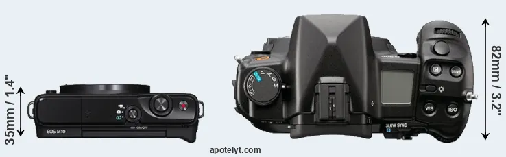 The side-by-side display below illustrates the physical size and weight of the Canon M10 and the Sony A900. The two cameras are presented according to their relative size. Three consecutive views from the front, the top, and the rear side are shown. All width, height and depth dimensions are rounded to the nearest millimeter.