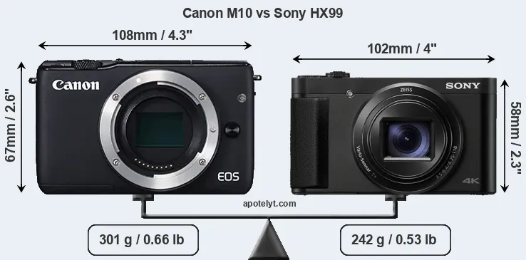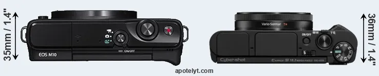 The side-by-side display below illustrates the physical size and weight of the Canon M10 and the Sony HX99. The two cameras are presented according to their relative size. Three consecutive perspectives from the front, the top, and the back are available. All size dimensions are rounded to the nearest millimeter.