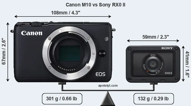 An illustration of the physical size and weight of the Canon M10 and the Sony RX0 II is provided in the side-by-side display below. The two cameras are presented according to their relative size. Three consecutive perspectives from the front, the top, and the back are available. All width, height and depth dimensions are rounded to the nearest millimeter.