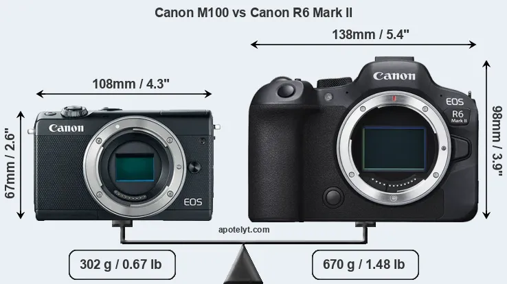 If the front view area (width x height) of the cameras is taken as an aggregate measure of their size, the Canon R6 Mark II is considerably larger (87 percent) than the Canon M100. Moreover, the R6 Mark II is substantially heavier (122 percent) than the M100. It is noteworthy in this context that the R6 Mark II is splash and dust-proof, while the M100 does not feature any corresponding weather-sealing.