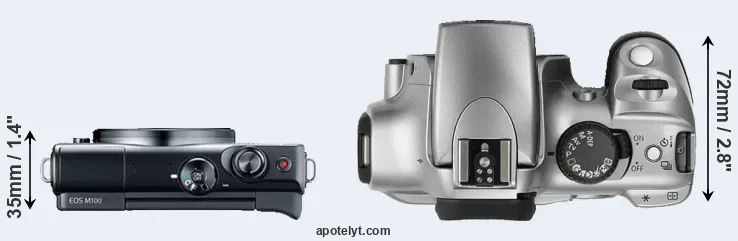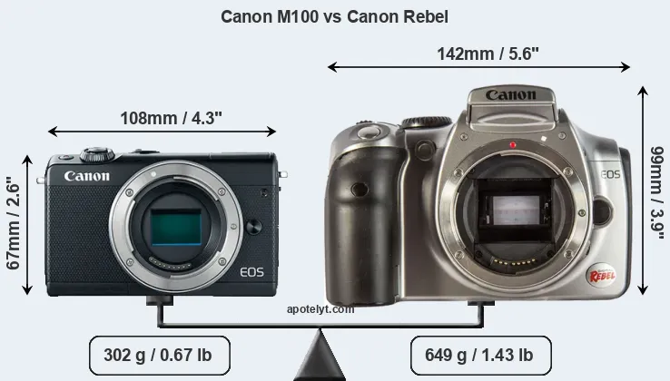An illustration of the physical size and weight of the Canon M100 and the Canon Rebel is provided in the side-by-side display below. The two cameras are presented according to their relative size. Three consecutive views from the front, the top, and the rear side are shown. All width, height and depth measures are rounded to the nearest millimeter.