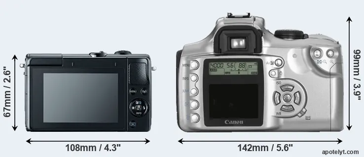 The Canon EOS M100 and the Canon EOS Digital Rebel (labelled Canon 300D in some countries) are two digital cameras that were revealed to the public, respectively, in August 2017 and August 2003. The M100 is a mirrorless interchangeable lens camera, while the Rebel is a DSLR. Both cameras are equipped with an APS-C sensor. The M100 has a resolution of 24 megapixels, whereas the Rebel provides 6.3 MP.