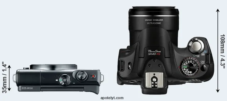 The physical size and weight of the Canon M100 and the Canon SX40 are illustrated in the side-by-side display below. The two cameras are presented according to their relative size. Three consecutive views from the front, the top, and the rear side are shown. All size dimensions are rounded to the nearest millimeter.