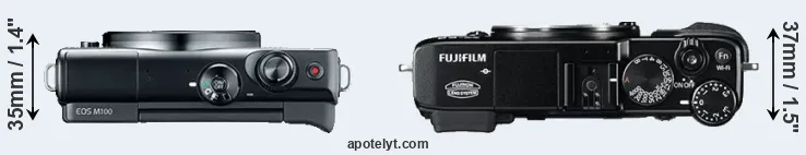 The physical size and weight of the Canon M100 and the Fujifilm X-E2 are illustrated in the side-by-side display below. The two cameras are presented according to their relative size. Three consecutive views from the front, the top, and the rear side are shown. All size dimensions are rounded to the nearest millimeter.