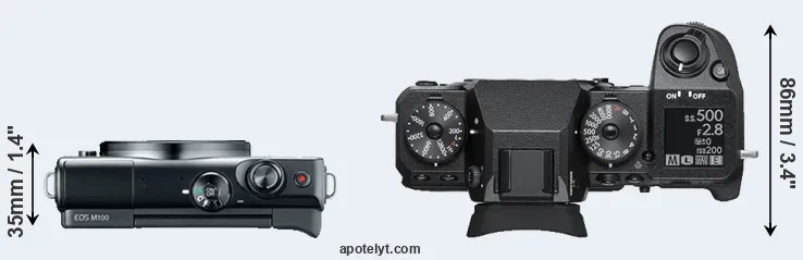 An illustration of the physical size and weight of the Canon M100 and the Fujifilm X-H1 is provided in the side-by-side display below. The two cameras are presented according to their relative size. Three consecutive perspectives from the front, the top, and the back are available. All size dimensions are rounded to the nearest millimeter.