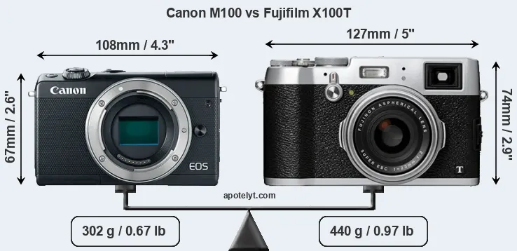 The physical size and weight of the Canon M100 and the Fujifilm X100T are illustrated in the side-by-side display below. The two cameras are presented according to their relative size. Three successive views from the front, the top, and the rear are shown. All width, height and depth measures are rounded to the nearest millimeter.
