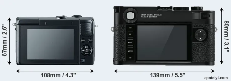 If the front view area (width x height) of the cameras is taken as an aggregate measure of their size, the Leica M10 is considerably larger (54 percent) than the Canon M100. Moreover, the M10 is substantially heavier (119 percent) than the M100. It is noteworthy in this context that the M10 is splash and dust-proof, while the M100 does not feature any corresponding weather-sealing.