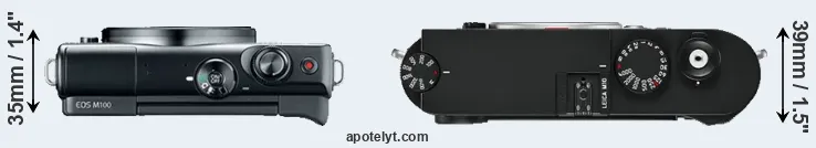 The physical size and weight of the Canon M100 and the Leica M10 are illustrated in the side-by-side display below. The two cameras are presented according to their relative size. Three successive views from the front, the top, and the rear are shown. All width, height and depth measures are rounded to the nearest millimeter.