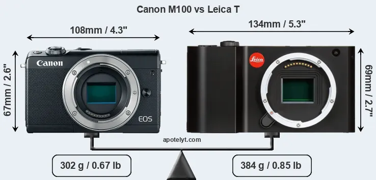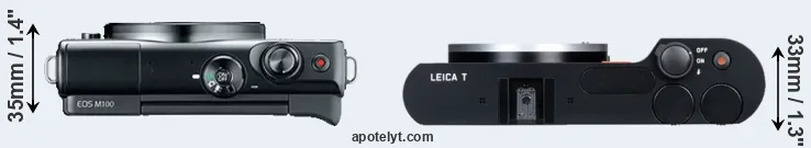 An illustration of the physical size and weight of the Canon M100 and the Leica T is provided in the side-by-side display below. The two cameras are presented according to their relative size. Three successive views from the front, the top, and the rear are shown. All size dimensions are rounded to the nearest millimeter.
