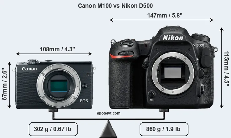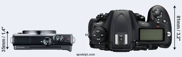 The side-by-side display below illustrates the physical size and weight of the Canon M100 and the Nikon D500. The two cameras are presented according to their relative size. Three consecutive perspectives from the front, the top, and the back are available. All width, height and depth measures are rounded to the nearest millimeter.